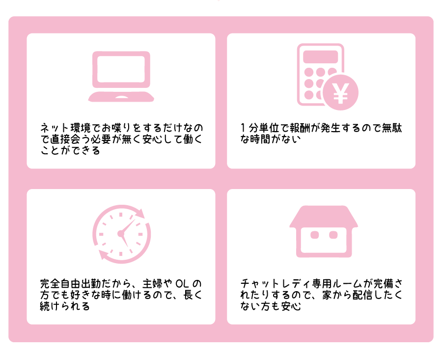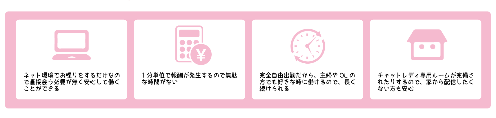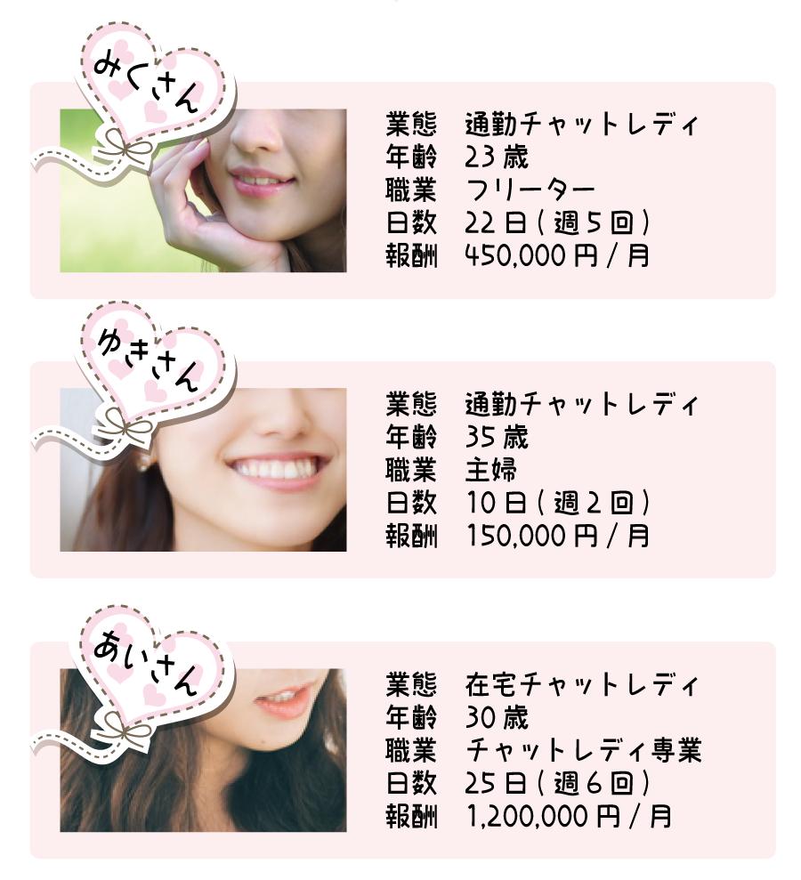 現役20年以上の女性経営者がチャットレディとして稼げるノウハウを徹底的にサポート!またライフスタイルに合わせて無理のない働き方を提案いたします。